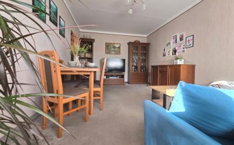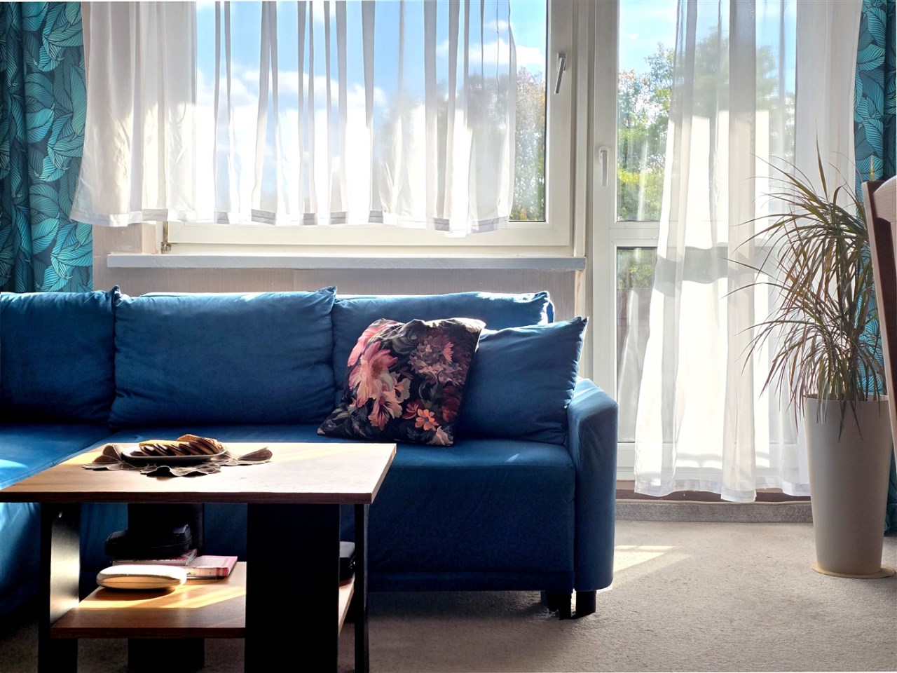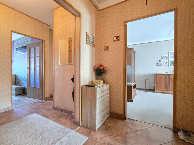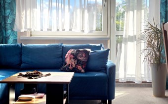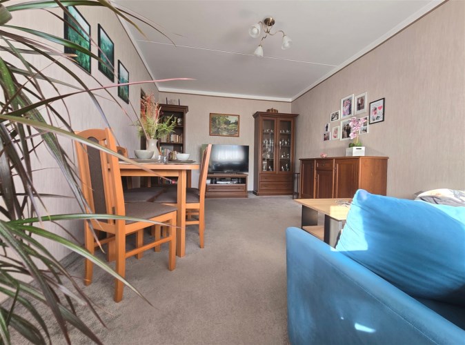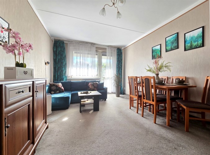Salon stanowi centralny punkt mieszkania, jasny, przestronny i pełen naturalnego światła dzięki ekspozycji południowej. Wykładzina w delikatnym, beżowym kolorze położona w listopadzie 2022 roku oraz jasna tapeta na ścianach wprowadzają poczucie ciepła i spokoju. Meble widoczne na zdjęciach mogą pozostać w mieszkaniu, co stanowi dodatkowe udogodnienie dla przyszłych właścicieli.