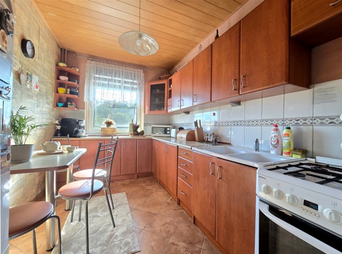 Kuchnia utrzymana jest w ciepłych, brązowych tonach, które tworzą przyjemną, domową atmosferę. Wyposażona została w solidne meble w zabudowie, zapewniające dużo miejsca do przechowywania. Na suficie zastosowano boazerię, która nadaje wnętrzu charakteru, a na podłodze położono płytki, trwałe i łatwe w utrzymaniu czystości.