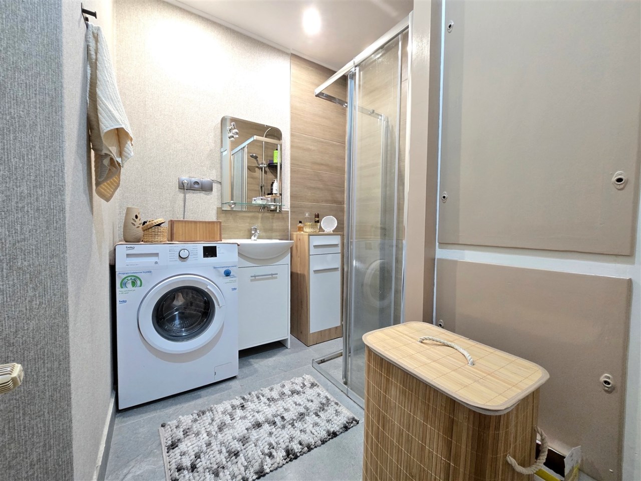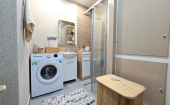 Łazienka przeszła generalny remont w listopadzie 2024 roku. Wymieniono całą instalację kanalizacyjną, a wnętrze wykończono w jasnej, nowoczesnej kolorystyce. Znajduje się w niej kabina prysznicowa, na podłodze ułożono płytki, a ściany zdobi połączenie tapety i płytek imitujących drewno. Toaleta pozostaje w dobrym, zadbanym stanie, spójnym stylistycznie z resztą mieszkania.