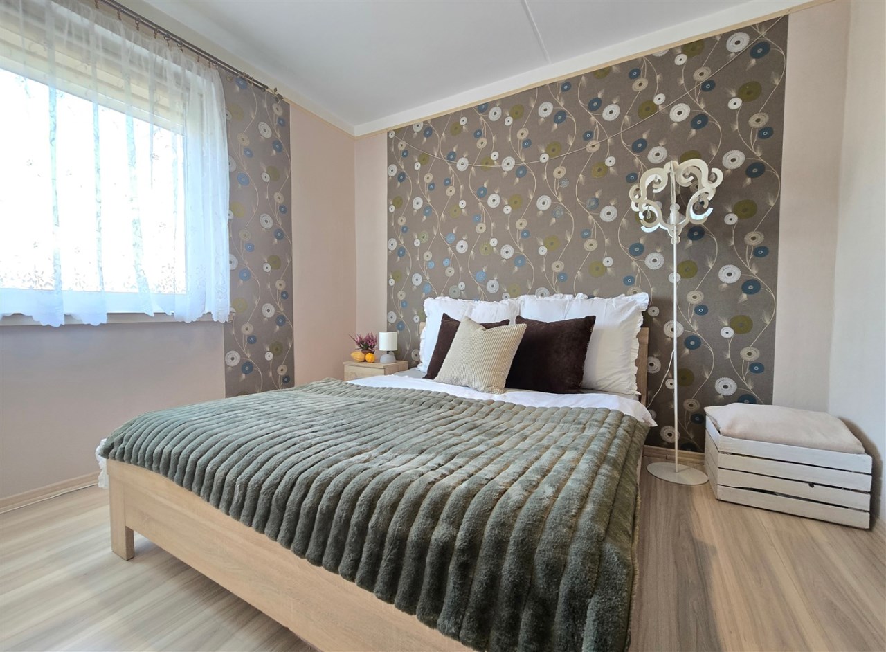 Mieszkanie położone jest w malowniczej części Pogwizdowa, na jego obrzeżach, gdzie dominuje zieleń i spokój. Z okien rozciąga się przyjemny widok na otwartą przestrzeń, a nie na gęstą zabudowę. Mimo kameralnego charakteru okolicy, wszystkie niezbędne punkty są w zasięgu ręki – tuż obok znajduje się lokalny sklep, a większy market oddalony jest zaledwie o około 800 metrów.