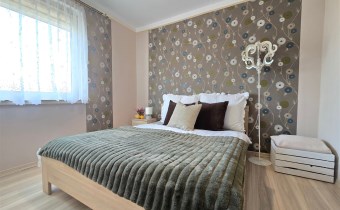W sypialni znajduje się duża, pojemna szafa, która zapewnia wygodne miejsce do przechowywania ubrań i dodatków. Pomieszczenie jest ustawne i daje możliwość stworzenia przytulnej przestrzeni do wypoczynku.