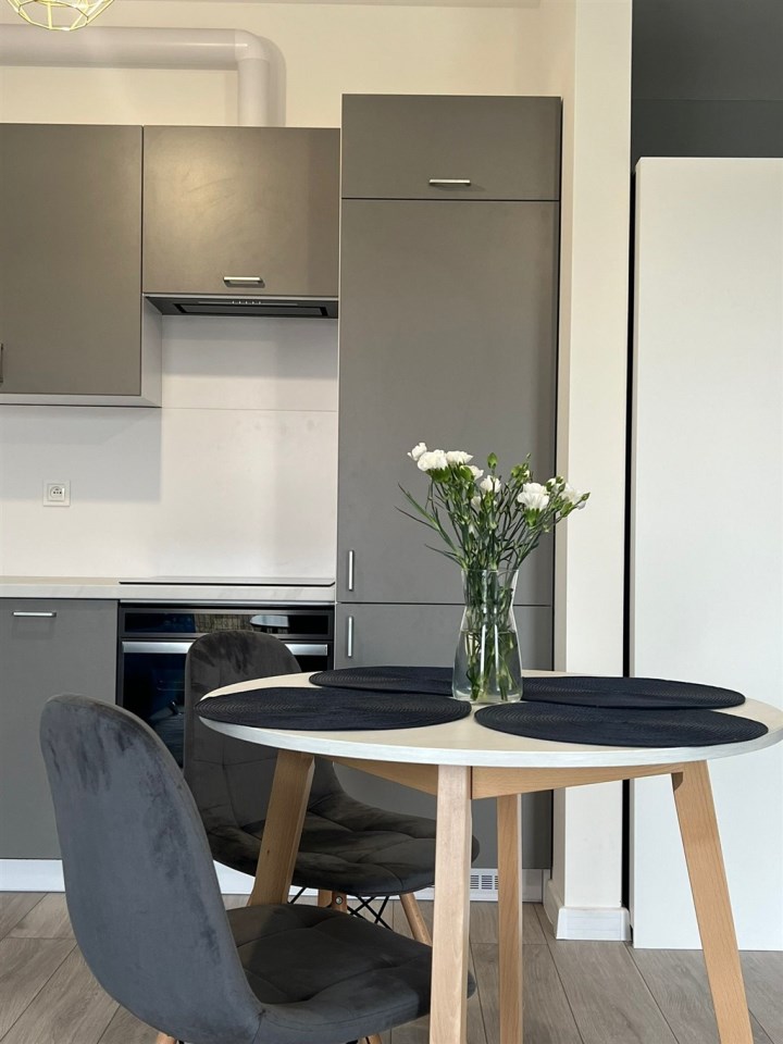Sypialnia została wyposażona w wygodne łóżko z materacem, a w przedpokoju znajduję się praktyczna szafa, co zwiększa funkcjonalność mieszkania. Całość utrzymana jest w harmonijnej kolorystyce szarości i bieli, która nadaje nowoczesnego charakteru. Kuchnia jest w pełni wyposażona, w łazience znajduje się prysznic, WC, pralka, a dzięki zamontowanym oknom PCV mieszkanie zapewnia ciszę i komfort.