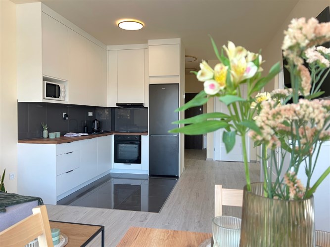 Nieruchomość składa się z dużego pokoju z aneksem kuchennym o powierzchni ok 28m2, dwóch sypialni, łazienki, oddzielnego wc, pomieszczenia gospodarczego oraz przedpokoju. Z salonu wychodzi się na duży taras o powierzchni prawie 20 m2 z pięknym widokiem na góry.