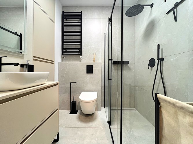 Mieszkanie zostało wykończone w wysokim standardzie, z dbałością o każdy detal. W kuchni znajduje się pełne wyposażenie AGD – lodówka, zmywarka, piekarnik oraz płyta grzewcza zaś sypialnie zostały wyposażone w praktyczne zabudowane szafy, wygodne łóżka i biurko do pracy.
