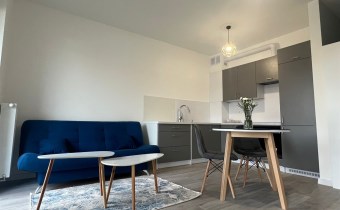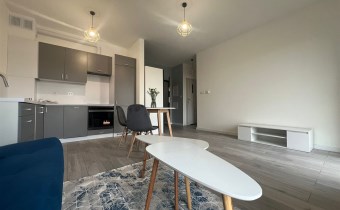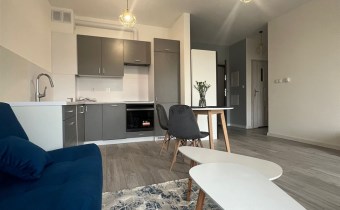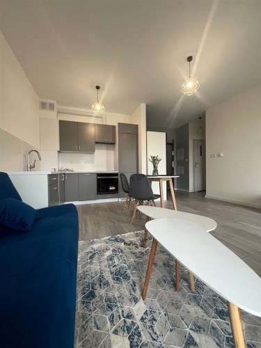 Sypialnia została wyposażona w wygodne łóżko z materacem, a w przedpokoju znajduję się praktyczna szafa, co zwiększa funkcjonalność mieszkania. Całość utrzymana jest w harmonijnej kolorystyce szarości i bieli, która nadaje nowoczesnego charakteru. Kuchnia jest w pełni wyposażona, w łazience znajduje się prysznic, WC, pralka, a dzięki zamontowanym oknom PCV mieszkanie zapewnia ciszę i komfort.
