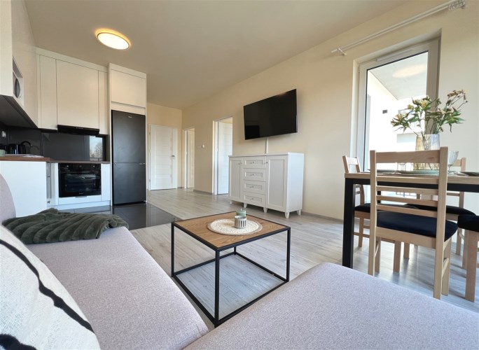 Salon połączony z aneksem kuchennym. W salonie znajduje się kanapa, komoda RTV wraz z telewizorem, stół z krzesłami. Kuchnia została zaprojektowana z myślą o jak najlepszej jej funkcjonalności. Wykończenie kuchni w klasycznych kolorach bieli, drewna i szarego. Kuchnia jest wyposażona w sprzęty RTV.